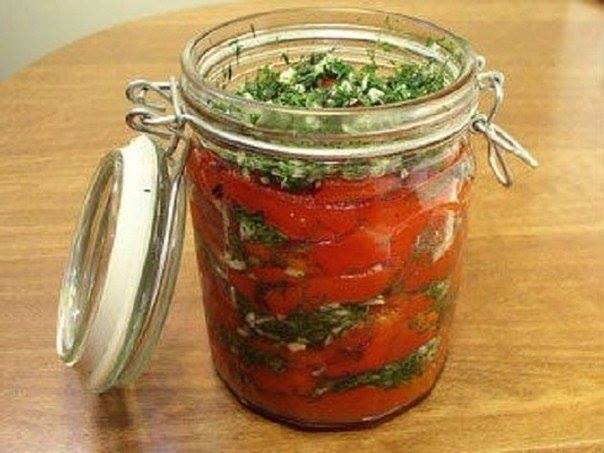 Перец порционно опускать в кипящий маринад и варить в течение 3-4 минут. Сразу же выкладывать в банки, переслаивая измельченным чесноком и зеленью.