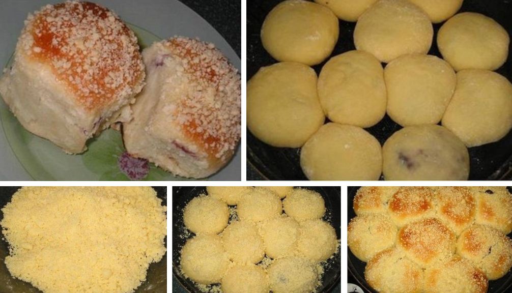Сковороду или небольшой противень или форму смазать сливочным маслом.Каждый шарик раскатывать и класть в центр немного (не больше чайной ложки неполной) любой начинки,я делала с черничным вареньем,можно с ягодами или фруктами,вареной сгущенкой,половинкой конфеты «коровка»,если варенье слишком жидкое то добавьте в него немного муки или панировочных сухарей.Края шарика хорошо защипать посыпая мукой придав булочке круглую форму,укладывать шарики в сковороду на небольшом расстоянии друг от друга швами вниз,места где булочки будут соприкасаться смазать немного растительным маслом кисточкой,так булочки будет легко разделить после выпечки,сковороду с булочками накрыть пленкой,оставить до подъема на 20 минут.