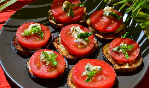 На кружочки баклажанов выкладываем по половине чайной ложки соуса.