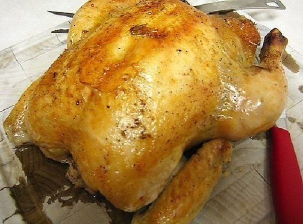Где-то после одного часа можно начинать присматривать за готовностью, периодически приоткрывая фольгу. В самом конце приготовления, когда при прокалывании выделяется светлый сок, конверт из фольги нужно открыть и, смазав верх курочки еще сметаной, дать получше зарумяниться.