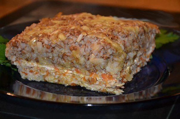 Сваренную до готовности гречку, охладить и добавить очищенные и потёртые на крупной тёрке яблоки, натертый на крупной тёрке полутвердый сыр, хорошо вымешать и выложить на фарш с зажаркой. Слегка примять.
