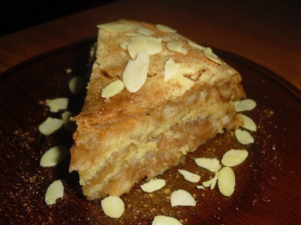 Выкладываем яблочный пирог в форму, смазанную слоями — 3 слоя сухой смеси, 2 слоя яблок, выкладываем на дно 1 часть сухой смеси, далее слой яблок, снова сухая смесь, опять яблоки и заканчиваем сухой смесью.