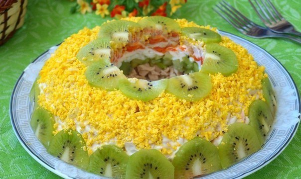 Отварить куриное филе, морковь и яйца до готовности. Нарезаем куриное филе кубиками. Нарезаем 2 киви, остальные оставляем для украшения. Ставим на плоскую тарелку в центр стакан, выкладываем вокруг него куриное филе. Сверху выкладываем кубики нарезанный кубиками киви. Смешать майонез с чесноком и наносим сверху киви.