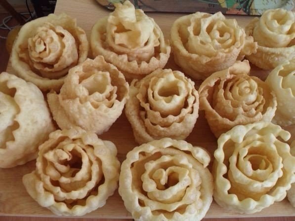 5. Раскаливаем до кипения растительное масло в казане, либо глубокой сковородке. Обматываем ленточкой конец скалки и опускаем в кипящее масло, придерживая конец спирали во – избежание её внезапного раскручивания.