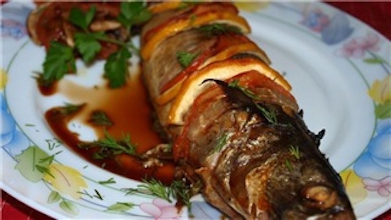 В каждый разрез положить ломтик лимона, ломтик помидора, ломтик лука.