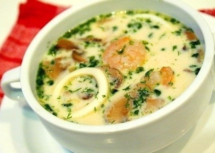В суп добавить морепродукты и варить 1 мин. Влить сливки, довести до кипения и тут же снять с огня. Посыпать рубленым укропом и дать супу настояться 30 мин. под крышкой.