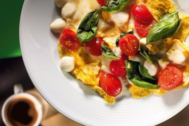 Помешивая деревянной лопаткой, готовить около 2 минут, до того, как омлет немного подрумянится снизу и почти застынет сверху.
