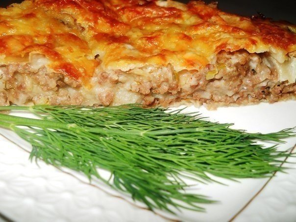 Укладываем в форму, смазанную маслом, слоями: лаваш, фарш, лаваш, фарш, лаваш.