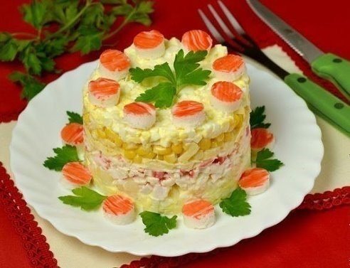 Слои: тертые яйца, кусочки ананасов, нарезанные крабовые палочки, тертый сыр, кукуруза и завершаем снова яйцами.