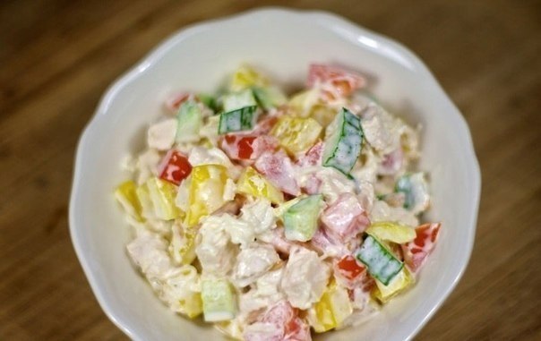 Болгарский перец нарежьте некрупным кубиком и добавьте в салатницу.