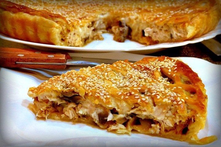 Раскатываем из большей части пласт. Выкладываем пласт в смазанную форму, накалываем в нескольких местах. Выкладываем начинку из курицы и грибов. Сверху распределяем соус бешамель.