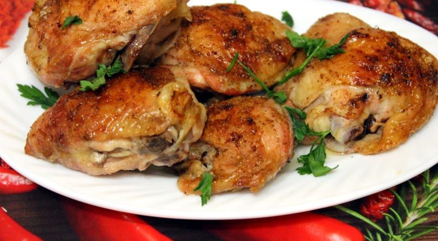 Выкладываем бедрышки в форму, застеленную фольгой.