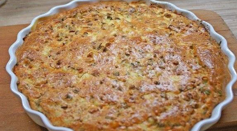 Сверху выкладываем начинку (начинка может быть любая: в этот раз была отварная семга, рис, тертый твердый сыр), сверху выливаем вторую половину теста.
